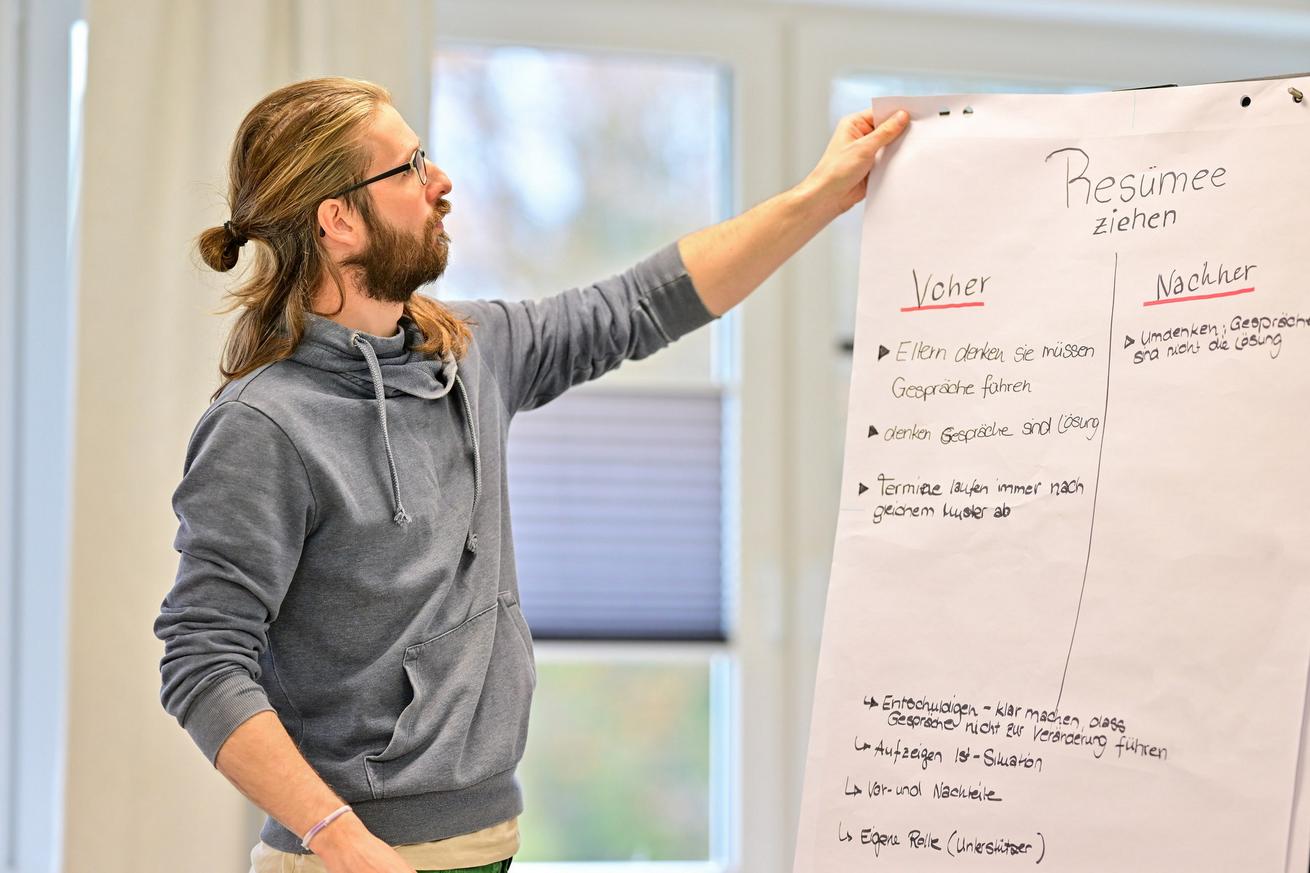 Muster der Selbst-, Fremd -und Problemwahrnehmung der Eltern erkennen und relativieren (zum Beispiel: Vereinfachungen, Generalisierungen, Stereotypisierungen). Beobachtungs- und Reflexionsmöglichkeiten der Eltern erweitern helfen. Eskalationsschemata erkennen und verstehen lernen. Neue Kommunikations- und Verhaltensziele festlegen und konkretisieren.